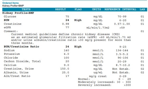 On the laboratory front, the NKF Laboratory Engagement Initiative has promoted standardized uACR testing with reporting in mg/g, eliminating the microalbumin term. Major U.S. laboratories now offer a kidney profile combining eGFR with uACR, simplifying ordering and reporting format. See the example from LabCorp shown together with the basic metabolic panel.