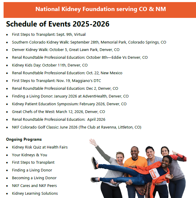 The National Kidney Foundation’s Kidney Education Symposium is an opportunity to bring together anyone affected by kidney disease (pre-dialysis, ESRD, transplant, living donors, care givers and family members) to learn about topics which concern the patient and their entire family. Save the Date Feb. 22, 2026 in Denver, CO and offered virtually. Pre-Register by reaching out to Danielle.