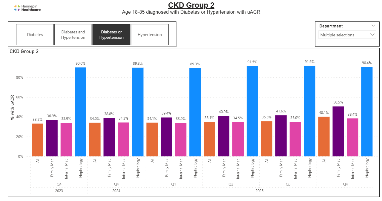 Hennepin Healthcare is committed to making CKD screening and proper diagnosis a standard of practice across all care teams. To further diffuse change in 2026, the team expanded engagement in primary care residency programs and hosted additional educational sessions for clinicians. Looking ahead, the team will evaluate ongoing utilization of existing CDS tools and explore additional modifications among other strategies to improve CKD care outcomes.